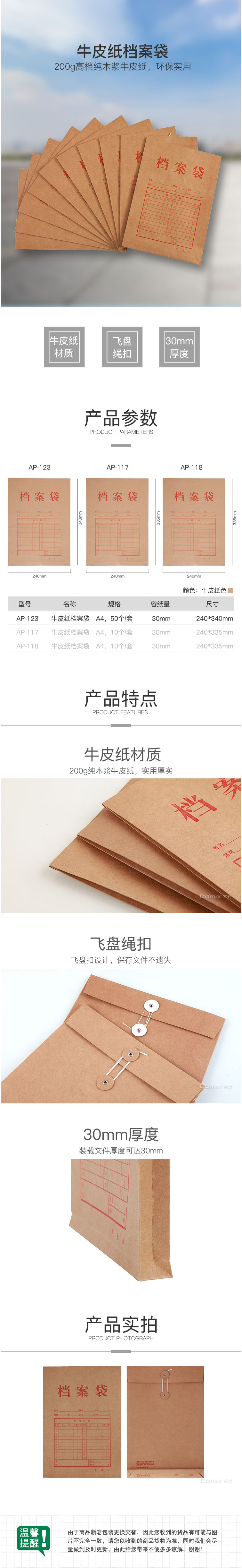 商品名称:齐心 AP-123 本色国产牛皮纸 档案袋A A4 竖式 50个/套