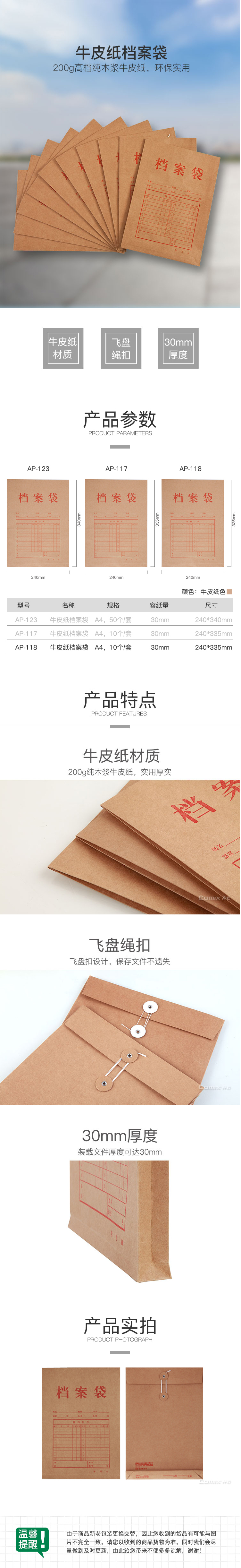 商品名称:齐心 AP-118 本色纯木浆牛皮纸 竖式档案袋 A4 10个/套