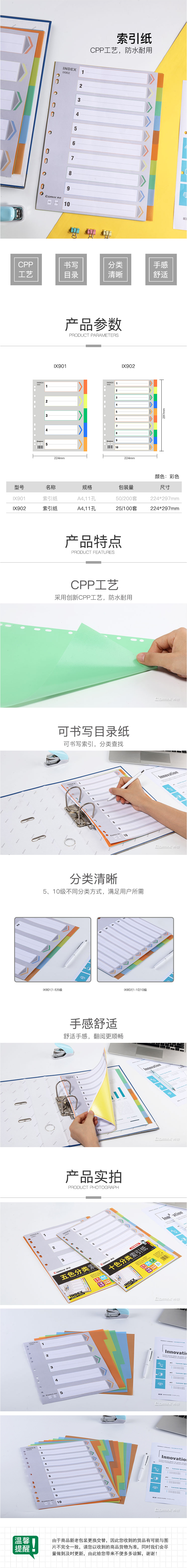 商品名称:齐心 IX902 易分类 十色索引纸 A4 11孔 PP