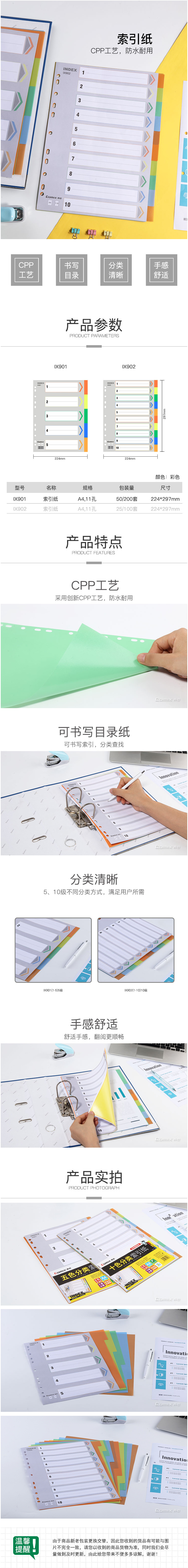 商品名称:齐心 IX901 易分类 五色索引纸 A4 11孔 PP