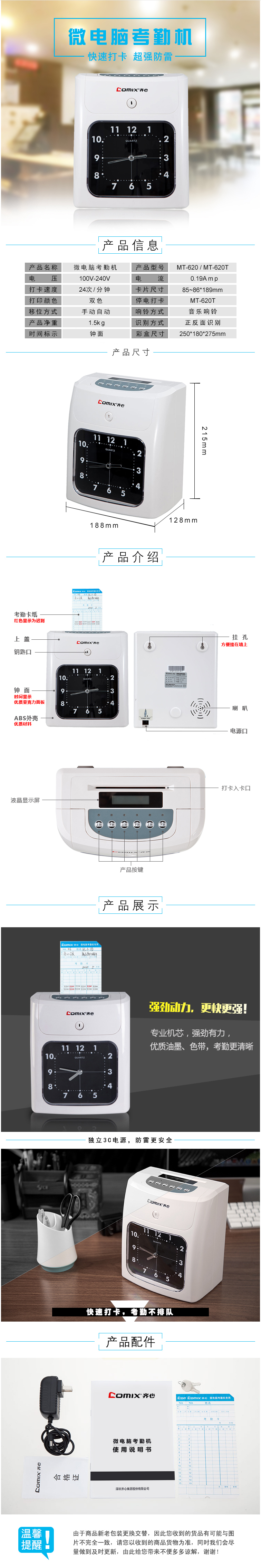 商品名称:齐心 MT-620 微电脑考勤机 超值停电不打卡