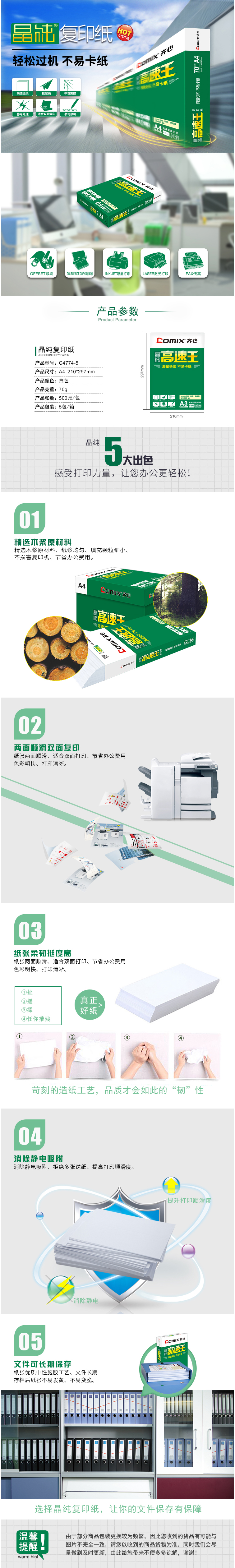 商品名称:齐心 C4774-5 晶纯高速王复印纸打印纸70克 A4 5包/件 56件/整卡板