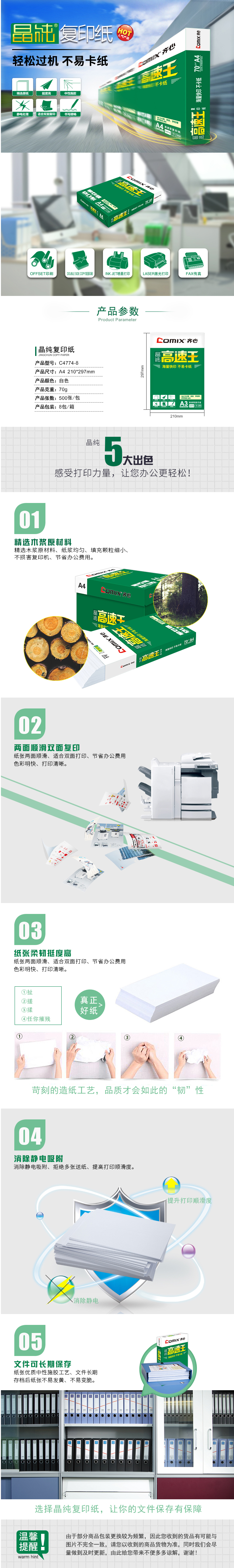 商品名称:齐心 C4774-8 晶纯高速王复印纸打印纸70克 A4 8包/件 35件/整卡板