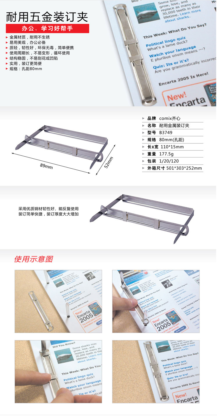 商品名称:齐心 B3749 耐用金属装订夹 50套/盒