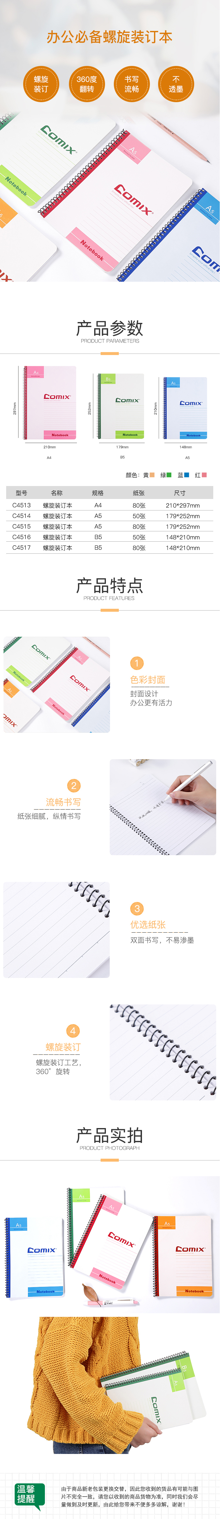 商品名称:齐心 C4515 办公必备螺旋装订本 A5 80张笔记本软抄本