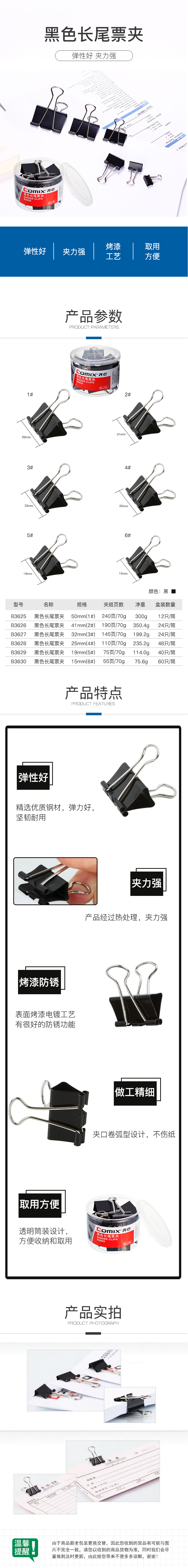 商品名称:齐心 B3629黑色长尾夹票夹 5# 19mm 40只/筒
