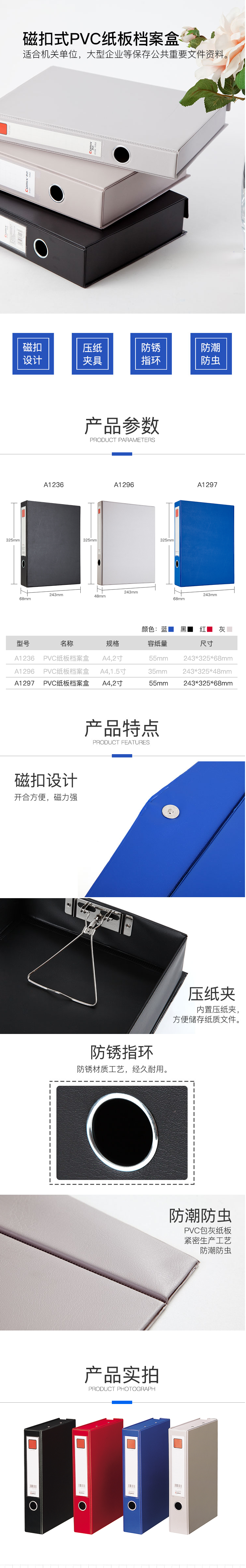 商品名称:齐心 A1297 办公必备磁扣式PVC档案盒 A4 55MM
