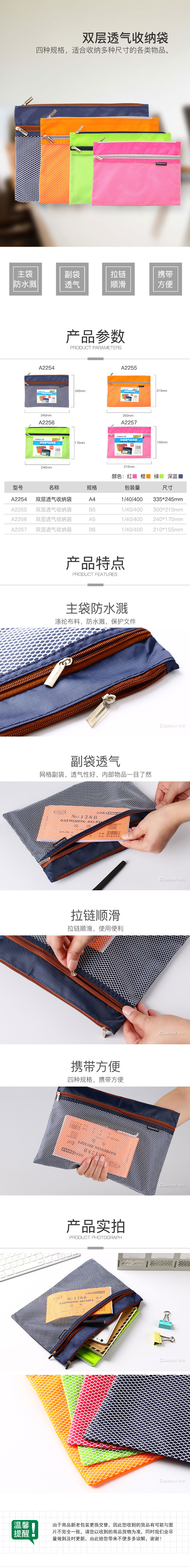 商品名称:齐心 A2254 双层彩色透气收纳袋 A4